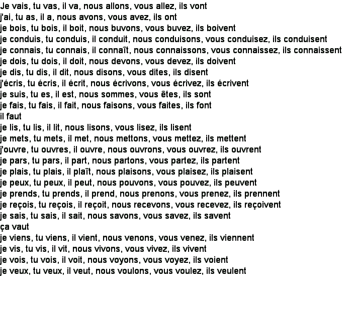 always end in IR or Re but do not follow the regular conjugations. Instead, most of them vaguely parallel the third conjugation. Here is a list of the main ones, with audio: |