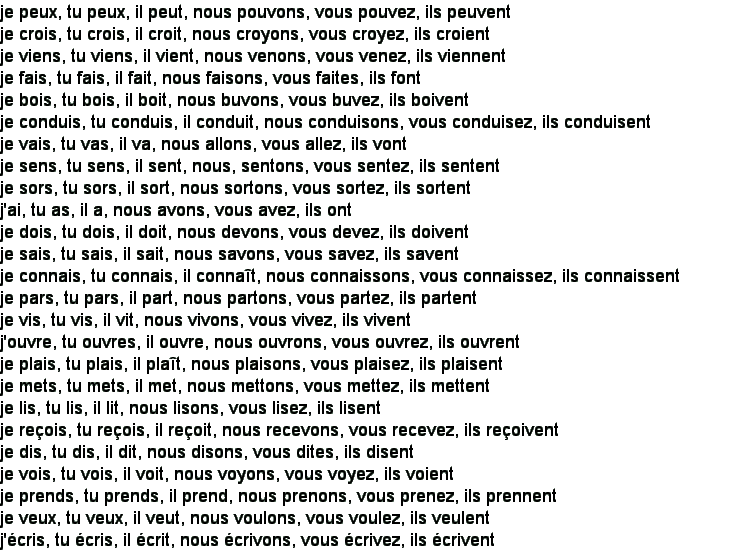 Tu chantes Il chante Nous chantons Vous chantez Ils chantent Verbs of the third group end with RE. Their conjugation is rather straightforward: EX: Vendre (To sell) Je vends Tu vends Il vend Nous vendons Vous vendez Ils vendent Though a good number of RE verbs are irregular many follow the same conjugation pattern as above for the present: EX Mettre (to put, to put on) Je mets Tu mets Il met Nous mettons Vous mettez Ils mettent